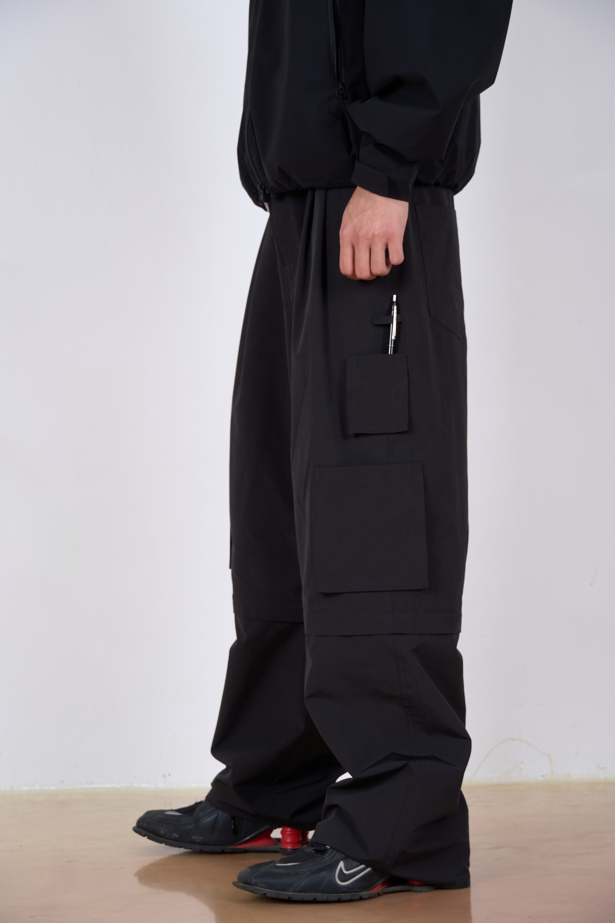 바지의 상부 하부를 ykk지퍼를 사용해 절개를 만들어 긴 기장으로, 무릎의 절개를 오픈하여 무릎이 트인 형태로, 마지막으로 전부 절개하여 떼어내 버뮤다 팬츠로도 착용이 가능하게 디자인하였습니다.